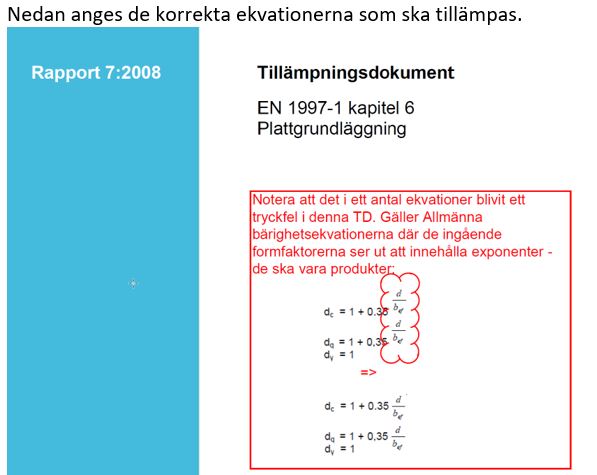 Fråga: Vid beräkning av grundtryckets dimensionerande brottvärde med allmänna bärighetsekvationen har SS-EN 1997-1 kommit med ett exempel i Bilaga D till standarden. EKS har kommenterat bilagan enligt följande: "50 § Bilaga D behåller, under förutsättning att inverkan av grundläggningsnivå, hållfasthet över grundläggningsnivå samt lutande intilliggande markyta beaktas, sin informativa karaktär vid nationell tillämpning. (BFS 2015:6)". Implementeringskommission för Europastandarder inom Geoteknik har i IEG Rapport 7:2008 kommit med ett exempel i Bilaga C.3 till rapport. Samma metodik som i Bilaga D till standarden används. Däremot skiljer sig några ekvationer åt, som till exempel ekvationerna för bärighetsfaktorer och korrigeringsfaktorer för fundamentform. Ska man följa IEGs ekvationer eller är det ändå standard som gäller?